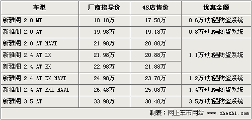 據(jù)廣州本田北京地區(qū)4S店銷售人員介紹,現(xiàn)購(gòu)買新雅閣均有6千-3.5萬(wàn)不等的優(yōu)惠,最低售價(jià)17.58萬(wàn),另贈(zèng)送“車行無(wú)憂”加強(qiáng)防盜系統(tǒng),例如您的車被拖走也會(huì)第一時(shí)間知道。3.5AT頂級(jí)型目前現(xiàn)車較少,則需要預(yù)定。