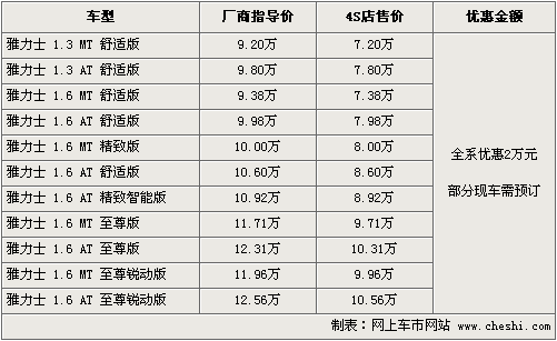 據(jù)廣汽豐田北京地區(qū)4S店銷售人員介紹,現(xiàn)在購買雅力士車型全系優(yōu)惠現(xiàn)金2萬元。目前雅力士1.3車型和1.6舒適、精致均有現(xiàn)車供應(yīng),至尊及銳動版現(xiàn)車數(shù)量較少,部分車型需預(yù)訂,F(xiàn)車顏色以黑色、紫色、銀色為主。如消費(fèi)者有意購買,到店詳談會有更優(yōu)惠的價(jià)格。北京地區(qū)各4S店由于訂單不同,各店銷售的現(xiàn)車顏色有所不同。