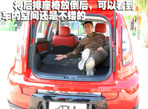 后排座椅可以全部放倒或是4/6比例分割放倒,這里面的空間足夠容納兩個(gè)人或是一臺(tái)大洗衣機(jī)或是電視了,買來(lái)SOUL用來(lái)搬家也許不是最好的主意,不過(guò)一旦有需求SOUL真的可以滿足儲(chǔ)物的需要了。后排座椅在乘坐三名乘員的時(shí)候顯得比較緊湊,畢竟這還只是一臺(tái)A0級(jí)的小車而已,所以對(duì)于空間我們也不應(yīng)有太多的奢求。