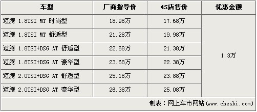 據(jù)北京一汽大眾經(jīng)銷店銷售人員介紹,邁騰全系車型全系優(yōu)惠1.3萬(wàn)元。經(jīng)1.3萬(wàn)元的優(yōu)惠后,全系入門(mén)級(jí)的1.8TSI MT時(shí)尚型的售價(jià)從18.98萬(wàn)元下降到了17.68萬(wàn)元。全系最高配的邁騰2.0TSI豪華版經(jīng)1.3萬(wàn)元優(yōu)惠后,售價(jià)降到了25.08萬(wàn)元。銷售人員還介紹,目前邁騰全系現(xiàn)車都比較充足。