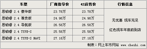據(jù)東風本田4S店銷售人員介紹,目前思鉑睿全系車型無優(yōu)惠,現(xiàn)車比較充足,現(xiàn)車顏色以白色、銀色、藍色為主。思鉑睿全系提供了塔夫綢白、彩晶黑、鈦金銀、炫影藍、炫動紫五種外觀顏色,以及靜雅黃、靜逸黑兩種內飾顏色供消費者選擇。TYPE-S車型還推出炫速紅專用色,在年底前現(xiàn)車將會到店。北京地區(qū)各4S店由于訂單不同,各店銷售的現(xiàn)車顏色有所不同。