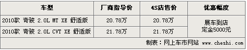 東風(fēng)日產(chǎn)2010款奇駿正式上市后,目前已經(jīng)全面接受消費(fèi)者預(yù)訂,訂金為2千元-5千元不等,部分4S店2010款展車已經(jīng)到店,消費(fèi)者可以到店賞車看車,F(xiàn)車預(yù)計(jì)11月份會(huì)陸續(xù)到店,目前有關(guān)新車方面的優(yōu)惠活動(dòng)暫時(shí)沒有推出。