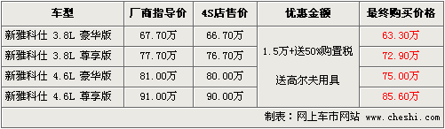 據(jù)進口現(xiàn)代4S店銷售人員介紹,目前新雅科仕車型優(yōu)惠1.5萬元,并返還50%購置稅。返還的購置稅分別從2.9萬-3.9萬不等,其中4.6L尊享版購置稅最高返還近4萬元,最終購買價格約85.6萬元。新雅科仕最低實際購買價格63.3萬元。另據(jù)介紹,現(xiàn)購買新雅科仕還贈送高爾夫用具。如消費者有意購買,到店詳談會有更優(yōu)惠的價格。北京地區(qū)各4S店由于訂單不同,各店銷售的現(xiàn)車顏色有所不同。