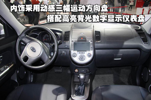 SOUL的內(nèi)飾上突出了強(qiáng)烈的未來感和科技感,三幅運(yùn)動(dòng)方向盤配合高亮背光數(shù)字顯示儀表盤,中控臺(tái)溫馨的色調(diào)設(shè)計(jì)加上夜晚會(huì)發(fā)出熒光的座椅。AUX & USB接口可以接入各種多媒體載體,前門兩側(cè)的音響發(fā)光系統(tǒng)隨著音樂有節(jié)奏地律動(dòng),配上環(huán)繞全車的8聲道喇叭帶來的完美音效表現(xiàn)和集成了常用控制按鈕的方向盤,在車內(nèi)就能輕松玩轉(zhuǎn)音樂時(shí)尚。