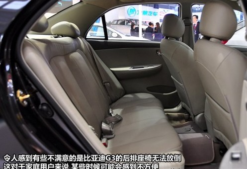 不過除了內(nèi)部做工值得肯定外,比亞迪G3也有不太令人滿意的地方。首先其車身外形的做工在某些細(xì)節(jié)上還略顯瑕疵,比如這輛展車的后備箱接縫明顯比合資車型要松散一點,而鈑金的精細(xì)程度也有可以提高的空間。最后有些令人感到意外的是比亞迪G3的后排座椅居然無法放倒,這對一款家用車型來說,也許會在日常使用時感到有些不便。