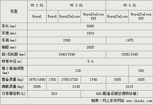 從配置表中可以看出,新一代皇冠共分2.5L,3.0L和4.3L三個排量共六款車型,預(yù)計還將有導(dǎo)航版等車型推出,車型總數(shù)將超過6款。相比現(xiàn)款車型,全新一代皇冠車身尺寸全面增加。車身長度達到5005mm,寬度1810mm,2.5和3.0排量車身高1500mm,4.3排量車身高1475mm,而軸距更達到了2925mm,比現(xiàn)款長出75mm。在裝備質(zhì)量上空載情況下比現(xiàn)款增加60-140kg ,滿載情況下增加80-145kg。