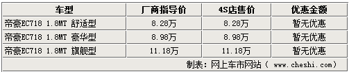 8月28日,吉利旗下的全新品牌-帝豪在濟(jì)南正式發(fā)布了首款轎車,吉利帝豪EC718這三款車型的廠商指導(dǎo)價(jià)分別為舒適型8.28萬元、豪華型8.98萬元、旗艦型11.18萬元。目前,帝豪EC718已經(jīng)開始在該品牌4S店內(nèi)銷售,但目前很多4S店內(nèi)的車型及顏色仍不是很全,現(xiàn)階段沒有任何現(xiàn)金優(yōu)惠。詳情如下: