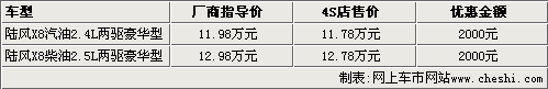 9月17日,陸風(fēng)首款城市型SUV正式在江西南昌發(fā)布上市,共推出兩款車型,分別是豪華汽油版和豪華柴油版,其中汽油版售價(jià)11.98萬元,而柴油版售價(jià)12.98萬元。目前陸風(fēng)X8雖然已經(jīng)正式上市,但在4S店出現(xiàn)車還不全,現(xiàn)金優(yōu)惠2000元。