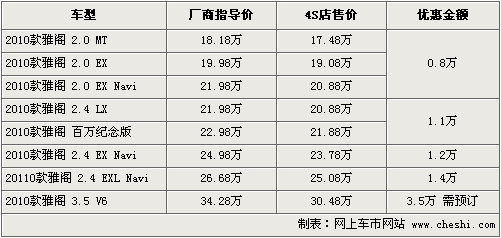 據(jù)廣州本田4S店銷售人員介紹,目前老款雅閣車型已停產(chǎn),銷售車型均為2010款。頂級(jí)車型購買可優(yōu)惠3萬元,2.0自動(dòng)檔標(biāo)配可優(yōu)惠8千元,F(xiàn)在店內(nèi)現(xiàn)車比較緊張,大部分車型顏色需要預(yù)訂,訂金為2000元。如消費(fèi)者有意購買,到店詳談會(huì)有更優(yōu)惠的價(jià)格。北京地區(qū)各4S店由于訂單不同,各店銷售的現(xiàn)車顏色有所不同。