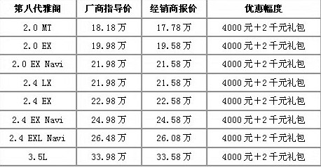 新雅閣,自誕生之日起就打著“史上最強(qiáng)雅閣”的旗號,10月更是一舉奪得昆明中級車上牌量亞軍,其實(shí)力不容小覷。近日,車天下編輯從廣本梁源店獲悉,自2009年12月14日至12月31日購置雅閣車型即可享受4000元?dú)q末現(xiàn)金優(yōu)惠以及2000元店慶購車禮包。具體車型及詳細(xì)優(yōu)惠政策,如下表: