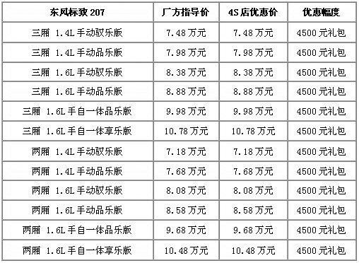 近日,車天下編輯從云南都市車迷寶獅標(biāo)致專營(yíng)店獲悉,目前購(gòu)標(biāo)致207全系車型,不但可以享受全現(xiàn)車供應(yīng),更能享受到4500元隨車大禮包贈(zèng)送。這在今年的年末顯得難能可貴,具體車型及詳細(xì)優(yōu)惠政策,如下表:
