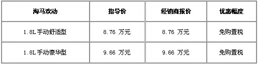 隨著年末的臨近,明年的購置稅新政成為城中話題。近日新政策公布,明年優(yōu)惠收縮至75折,讓不少觀望的朋友緊張起來。車天下編輯從昆明合達(dá)獲悉,為滿足消費者年底購車的迫切希望,現(xiàn)推出海馬歡動1.8L全系車型免購置稅活動。具體車型及詳細(xì)優(yōu)惠政策,如下表: