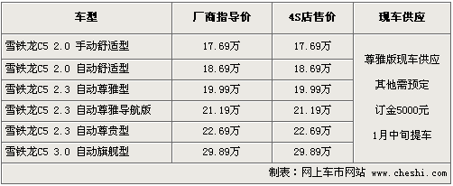 據(jù)東風(fēng)雪鐵龍4S店經(jīng)銷(xiāo)人員介紹,目前東風(fēng)雪鐵龍C5現(xiàn)車(chē)供應(yīng)也比較緊張,只有自動(dòng)尊雅版有少量黑色現(xiàn)車(chē)供應(yīng),其他款均需要預(yù)訂,訂金為5000元,預(yù)計(jì)1月中旬可以提車(chē)。