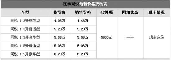 江淮同悅有1.3L和1.5L兩種排量,全為手動檔車型。分標準型、舒適型和豪華型三種配置。標準型無安全氣囊,配備有ABS制動防抱死系統(tǒng),四門車窗和電調后視鏡;舒適型增添了駕駛座安全氣囊、倒車雷達、遙控鑰匙和中控;豪華型相對于舒適型升級了副駕安全氣囊和前霧燈安全配置,配備了單碟CD機并升級了音響系統(tǒng),增加了后視鏡加熱功能和鋁合金輪轂。