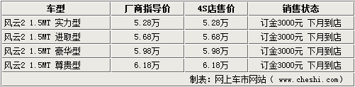 奇瑞經(jīng)銷商表示,現(xiàn)在店內(nèi)的風云2新車不全,消費者購車需要繳納3000元訂金并等待半個月才可提車。由于是全新的車型,所以現(xiàn)階段購車暫時沒有任何形式上的優(yōu)惠。