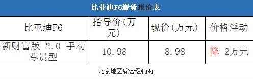 比亞迪F3是去年的銷量冠軍,和F3相比,比亞迪F6要低調(diào)很多,但是這并不意味著F6的性價(jià)比低。昨日,編輯從北京地區(qū)的幾家比亞迪汽車綜合經(jīng)銷商處了解到,近期比亞迪F6的優(yōu)惠再次增加,銷量最高的2.0手動尊貴版目前的降幅已經(jīng)達(dá)到了2萬元,購車后如果在店內(nèi)做一條龍服務(wù)的話,還可以再優(yōu)惠2000元,性價(jià)比非常不錯(cuò)。