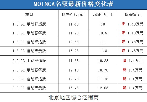 近日,編輯從北京地區(qū)綜合經(jīng)銷商處了解到,現(xiàn)代MOINCA名馭的現(xiàn)車比較充足,即使是冷門顏色車型,預(yù)定等待的時間也不會很久。據(jù)經(jīng)銷商透露,MOINCA名馭最高可以優(yōu)惠不到1.5萬元,并且會贈送一些基本的汽車裝潢;但是消費者要想以這個價格提車,需要在店內(nèi)做一條龍,其中車輛四項基本保險可以打9.5折(約合4100-4600元左右)。以下是MOINCA名馭最新價格變化表: