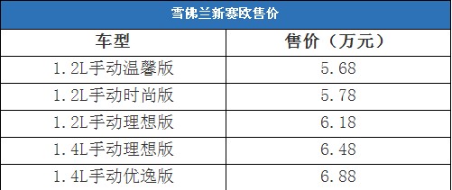 1月11日,上海通用雪佛蘭新賽歐正式上市,此次上市推出1.2L和1.4L排量共計(jì)5款車型,并有海星藍(lán)、皓空藍(lán)、琥珀橙、新月銀、珊瑚紅、茉莉白六種車身顏色可供選擇,售價(jià)5.68-6.88萬元之間。