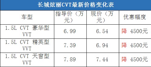 近日,編輯從北京地區(qū)綜合經(jīng)銷商處了解到,購買長城炫麗CVT車型有4500元的現(xiàn)金優(yōu)惠,店內(nèi)有黑色現(xiàn)車在售,部分車型預(yù)定等待10天左右就可以提車。據(jù)經(jīng)銷商透露,消費(fèi)者要想以這個價格提車,需要在店內(nèi)做購車一條龍服務(wù),其中車輛四項基本保險可以打8折(約合2800-2900元左右)。以下是長城炫麗CVT最新價格變化表:
