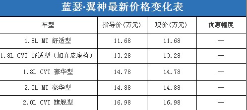近日,編輯從北京地區(qū)東南三菱4S經(jīng)銷商處了解到,藍(lán)瑟·翼神在店內(nèi)有少量現(xiàn)車(紅色、黑色),其中1.8L CVT舒適型在店中加裝了真皮座椅,價(jià)格是原指導(dǎo)價(jià)增加3000元。相比之下,編輯了解到藍(lán)瑟·翼神在綜合經(jīng)銷商處雖然沒(méi)有現(xiàn)車,但是現(xiàn)在訂車可以優(yōu)惠2000元現(xiàn)金,要等到春節(jié)之后才能夠提車。以下是藍(lán)瑟·翼神最新價(jià)格變化表: