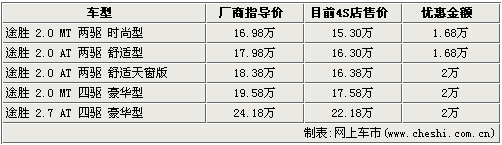 北京現(xiàn)代途勝是韓系車中非常經(jīng)典的一款城市型SUV,寬大的空間,時(shí)尚的外觀以及人性化的配置使眾多消費(fèi)者都鐘情它。據(jù)網(wǎng)上車市價(jià)格監(jiān)測系統(tǒng)顯示:目前購買途勝的消費(fèi)者最高可享受到2萬元的現(xiàn)金優(yōu)惠。具體車型見下表: