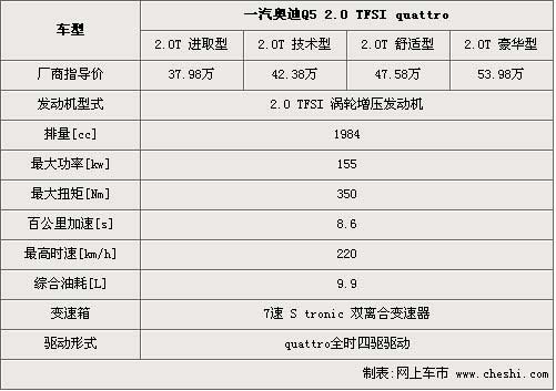 編輯總結(jié):總的來說,奧迪Q5技術(shù)型的配置相對比較低,不過在日常使用中也足夠用了;雖然舒適型比技術(shù)型稍貴,但是多了第三代的MMI人機交互系統(tǒng)可以算是提升了一個檔次,日常駕駛中的操作也變得更加便利;如果您有足夠的預(yù)算,那么全系頂配的豪華版不會讓您失望,在享受奢華的車內(nèi)環(huán)境的同時,發(fā)動機以及變速箱的匹配可以隨您的意愿匹配到最合適的狀態(tài)。