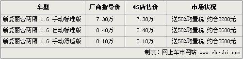 東風(fēng)雪鐵龍愛麗舍從9月份開始,對車型進(jìn)行了一次全面升級。2010款新愛麗舍在安全、舒適、節(jié)油和性能方面比老款有增加了相應(yīng)的配置,進(jìn)一步強(qiáng)化了新愛麗舍成熟的產(chǎn)品品質(zhì)。而09款兩廂愛麗舍更具城市便利性,其備箱空間絲毫不亞于三廂車型,是繼富康后的又一經(jīng)典兩廂叫用車。根據(jù)網(wǎng)上車市價(jià)格監(jiān)測系統(tǒng)顯示,目前購買愛麗舍兩廂,可享受購置稅減半,折合最高優(yōu)惠約3600元。具體車型價(jià)格行情如下: