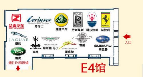 在本屆北京車展,E4館有斯巴魯、法拉利、瑪莎拉蒂、捷豹、路虎、蓮花、阿斯頓·馬丁、勞斯萊斯、世爵、光崗以及眾泰等13個(gè)品牌參展,主要亮點(diǎn)車型包括斯巴魯HYBRID TOURER概念車、法拉利599 GTO、法拉利458 Italia、瑪莎拉蒂GranCabrio、全新捷豹XJ以及勞斯萊斯Ghost等。