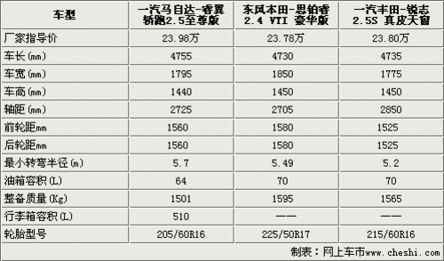 我們選取的三款車型都是位于該車系中黃金排量,售價都在24萬元左右。在車身尺寸方面睿翼轎跑是三款車型中最長的,同時睿翼轎跑又是唯一一款采用兩廂半的設(shè)計車型,這使得睿翼轎跑看起來動感十足。豐田銳志的軸距達到了2850是3款車型中最長的,保證了銳志內(nèi)部空間的寬敞。思鉑睿的前后輪距都要大于睿翼轎跑和銳志,達到了1580mm。同時在輪胎寬尺寸上也是最大的,這意味著思鉑睿的操控性能將要優(yōu)越于另外兩款車型。睿翼轎跑、思鉑睿和銳志的轉(zhuǎn)彎半徑都在5米左右。思鉑睿和銳志兩款車型的油箱都是70升,足以應(yīng)付一般家庭的正常使用,睿翼轎跑則要小點,容積為64升。