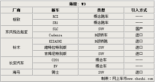 在W3館中,共有7家汽車廠商在此參展,除雪鐵龍/東風(fēng)雪鐵龍和開瑞外,其余廠商如標(biāo)致將帶來兩款概念車RCZ和SR1;東風(fēng)悅達(dá)起亞將帶來即將國產(chǎn)的SUV車型——SLC(海外版新獅跑)和以進(jìn)口方式引入的新中級(jí)車——Cadenza,鈴木將在本屆車展中帶來三款車型,其中新款轎跑車KAZASHI是最大的亮點(diǎn)。自主品牌也不甘寂寞,長(zhǎng)安汽車和海馬汽車分別帶來了C201概念車和SUV車型——騎士。
