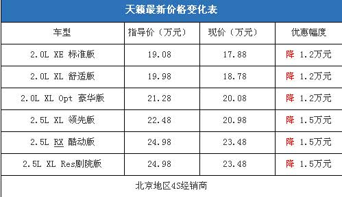 近日我們從東風日產(chǎn)北京海潤嘉4S經(jīng)銷商處了解到,天籟的現(xiàn)車充足,顏色也比較全,不過以銀色和黑色為主。如果部分車型需要預(yù)定,等待的時間為1個月左右,定金為2000元。目前2.0L排量車型可以優(yōu)惠1.2萬元,2.5L排量車型可以優(yōu)惠1.5萬元。