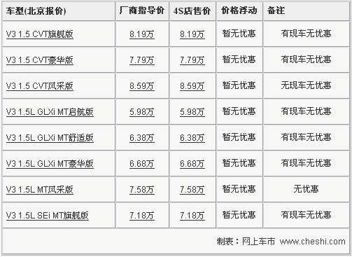 上市時(shí)間較長(zhǎng)的東南V3菱悅系列,相繼推出了全新的風(fēng)采版車型及CVT版車型,豐富的產(chǎn)品線也使這款車型的更受消費(fèi)者關(guān)注。網(wǎng)上車市網(wǎng)站由北京地區(qū)各家經(jīng)銷商處了解到,東南V3菱悅各個(gè)車型的現(xiàn)車比較齊全,只有個(gè)別顏色需要預(yù)訂。另外,東南V3菱悅CVT車型也已經(jīng)到店,有現(xiàn)車銷售。