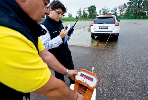 這一測試的目的在于測量車輛的牽引力,我們要使用一個十分精確的測量范圍達(dá)數(shù)千千克的測力計。正如在照片中看到的,車輛的四個輪子都在濕滑的大理石上,我們在上面說過,其附著力與在冰面上差不多。測力計的一邊通過一條鋼索與車體相連,另一邊固定在一個位置上。測試員啟動汽車把鋼索拉直,然后繼續(xù)加油直到車輪開始打滑,這時很多因素都要考慮,包括發(fā)動機(jī)功率、車的重量、輪胎的合成材料等,這些都是重要的參考數(shù)據(jù)。四驅(qū)車比兩驅(qū)車明顯占據(jù)上風(fēng),特別是XC60,其四驅(qū)版的牽引力比兩驅(qū)版高出了74%。Kuga兩個版本的差距為41%,略微小些。需要說明的是,正像前面說過的,沃爾沃兩款車的功率相差30馬力,其他方面沒有大的差別。在主要測試結(jié)束后,我們換了個地點重復(fù)剛才的測試,不是四個輪子都在大理石上,而是兩個在大理石上,兩個在瀝青上,仍然為濕滑路面。這也是為了測試防滑系統(tǒng)的功效,這時需要差速器的機(jī)械鎖止裝置發(fā)揮作用,Kuga和XC60上都沒有這一裝置。兩個輪子在瀝青上增加了附著力,可以看到測力計上顯示的數(shù)字與上次相比四輛車都增大了。福特兩驅(qū)車牽引力為602千克,四驅(qū)為820千克;沃爾沃兩款車的差距還是那么大,兩驅(qū)為710千克,四驅(qū)為1050千克。