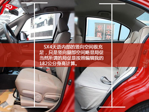 既然是跨界與SUV,那么想當(dāng)然的天語一定會有SUV的一大特點(diǎn),即是相對于轎車更加寬大的車內(nèi)空間,而在天語SX4的內(nèi)部,如果你的身高不高于180cm的話,那么天語完全可以給你很不錯(cuò)的車內(nèi)空間享受,只是其內(nèi)部乘坐感受硬邦邦的,比如內(nèi)飾材質(zhì)以及座椅與身體接觸的感覺等等,缺少了很多轎車應(yīng)有的乘坐舒適性。