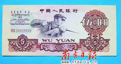 被收藏界稱為“豹號(hào)”的8個(gè)“8”連號(hào)人民幣現(xiàn)身云浮。日前,來自該市羅定的民間收藏家王河先生向記者展示其收藏的8個(gè)“8”連號(hào)的人民幣,該幣為1960年版的第三套人民幣5元紙幣,已退出流通領(lǐng)域。據(jù)了解,該5元幣曾獲世界紙幣設(shè)計(jì)金獎(jiǎng)。8個(gè)“8”的吉祥號(hào)碼被收藏界稱之為“豹號(hào)”,向來難得一見,目前已有來自茂名的收藏愛好者開價(jià)88888元求購(gòu)。(記者/楊紅雨特約通訊員/廖榮波)
