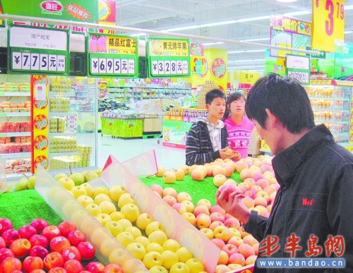 26日上午,記者走訪了家樂福、佳世客、大潤(rùn)發(fā)等超市,發(fā)現(xiàn)質(zhì)量比較好的紅富士定價(jià)全都在七元左右!斑@哪是蘋果旺季啊,價(jià)格比淡季賣得都高!辈簧兕櫩统虺蚣t彤彤、新鮮香甜的大蘋果,再看看“價(jià)格不菲”的標(biāo)價(jià)牌,望而卻步。