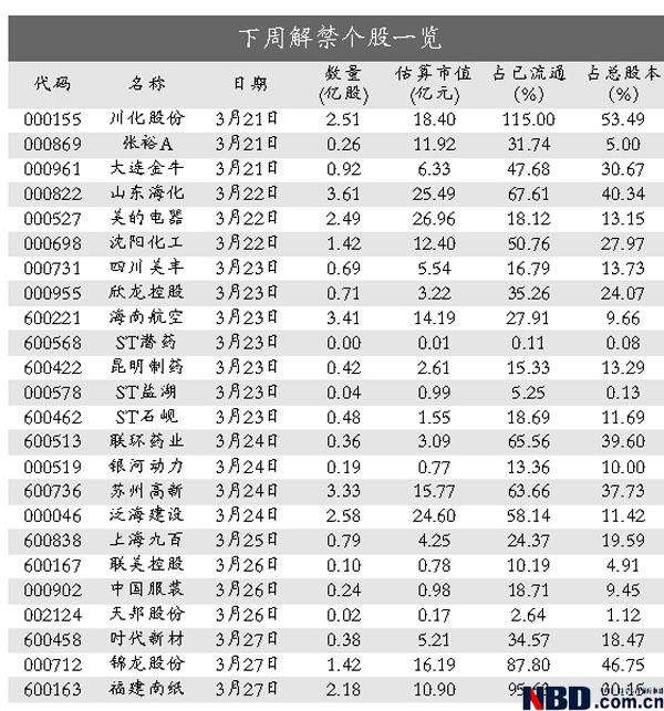 3月限售股解禁數(shù)量在連續(xù)兩周減少后,下周將會有小幅回升。據(jù)大智慧超贏數(shù)據(jù)統(tǒng)計(jì),下周將有28.54億股限售股將解禁上市流通,較本周的22.62億股增加了5.92億股,環(huán)比增加26.17%。若以昨日的收盤價計(jì)算,下周限售股的解禁市值也較本周增加了24.14億元,達(dá)到212.31億元。盡管下周限售股的解禁量與解禁市值有所回升,但是涉及到的公司僅有24家,較本周減少了3家。另外下周有五家公司在限售股解禁上市后將實(shí)現(xiàn)全流通。