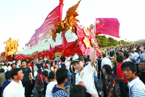 “黃金周”期間,天安門廣場人流如織,中外游客超過820萬人次,超過2008年國慶黃金周北京接待的游客總?cè)藬?shù)。北京市旅游局統(tǒng)計(jì),北京203個(gè)主要景點(diǎn)接待游客的總量突破了950萬人次。