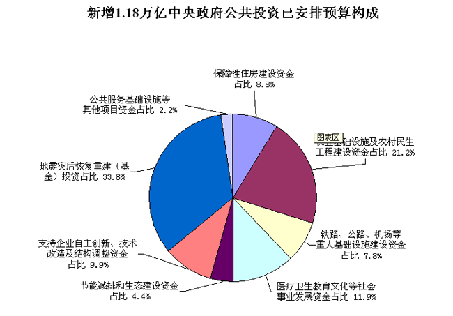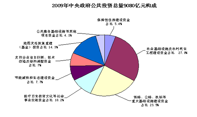 此外,2009年中央政府公共投資預(yù)算總量為9080億元,比上年增加4875億元,分項(xiàng)目安排情況如下:用于保障性住房建設(shè)資金493億元,占5.4%;農(nóng)業(yè)基礎(chǔ)設(shè)施及農(nóng)村民生工程建設(shè)資金2522億元,占27.8%;鐵路、公路、機(jī)場(chǎng)等重大基礎(chǔ)設(shè)施建設(shè)資金2134億元,占23.5%;醫(yī)療衛(wèi)生教育文化等社會(huì)事業(yè)發(fā)展資金926億元,占10.2%;節(jié)能減排和生態(tài)建設(shè)資金696億元,占7.7%;支持企業(yè)自主創(chuàng)新、技術(shù)改造及結(jié)構(gòu)調(diào)整資金633億元,占7.0%;地震災(zāi)后恢復(fù)重建(基金)投資1300億元,占14.3%;公共服務(wù)基礎(chǔ)設(shè)施等其他項(xiàng)目資金376億元,占4.1%。