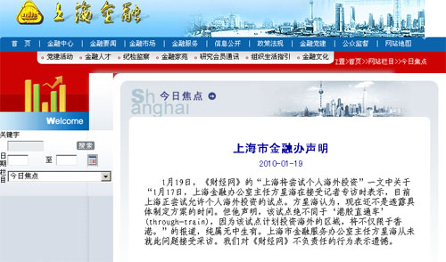 據(jù)上海金融辦網(wǎng)站刊出的聲明指出,《財經(jīng)網(wǎng)》有關“上海將嘗試個人海外投資”的報道,純屬“無中生有”,上海市金融服務辦公室主任方星海,從未就此問題接受采訪,對《財經(jīng)網(wǎng)》不負責任的行為,表示遺憾。