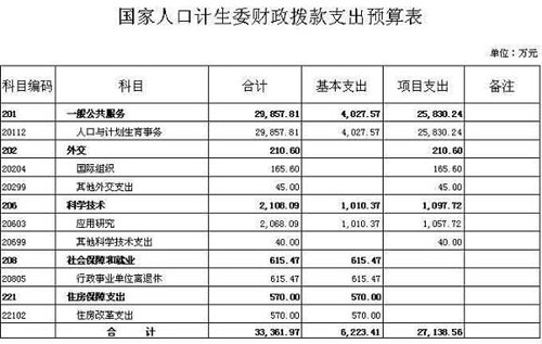 本表按支出功能分類科目編制,反映國家人口計(jì)生委年度部門預(yù)算中財(cái)政撥款支出的總體情況,按照基本支出和項(xiàng)目支出劃分。