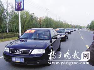 記者在現(xiàn)場(chǎng)看到,這支由28輛名車組成的豪華車隊(duì),包括3輛寶馬、11輛奧迪、6輛豐田,以及別克、本田、帕薩特等高檔轎車。約9時(shí)10分左右,這支豪華車隊(duì)開(kāi)始緩緩開(kāi)動(dòng)起來(lái),最前面由一輛別克轎車“開(kāi)道”,緊跟在后面的是一輛奔馳面包,車中坐著的就是當(dāng)日車隊(duì)接送的“主角”——張良憲花費(fèi)160萬(wàn)元從外地買來(lái)的藏獒。這輛奔馳面包車前扎著大紅的綢花,車的側(cè)面掛著一條紅色條幅“中國(guó)名獒160萬(wàn)元落戶宿遷張良憲藏獒繁育基地”。后面的車綿延跟進(jìn),每輛車都打著雙跳,緩緩前進(jìn),速度在20碼左右。
