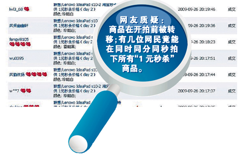 淘寶的安民公告,仍然為部分網(wǎng)友所不能接受。天涯網(wǎng)友“秋風(fēng)月無痕”認(rèn)為,淘寶沒出面解釋何以有三人能在同一分同一秒同時秒下三件商品!皟(nèi)有種種怪異之事,不得不讓人想到這是一場欺騙廣大中國人民的炒作行為。如果淘寶不能給出合理的讓人信服的解釋,那么最終受害的不單單是廣大受騙的群眾,更是淘寶網(wǎng)。” “秋風(fēng)月無痕”及幾名網(wǎng)友隨后在跟帖中貼出當(dāng)晚截圖,聲稱既然當(dāng)晚人太多,“不能正常瀏覽頁面”,而實(shí)際上商品已經(jīng)在20時03分之前下架,但網(wǎng)友卻截圖發(fā)現(xiàn)有多條20時17分到20時19分的記錄,“淘寶怎么解釋這幾條記錄,03分到17分之間是空的,但是17分到19分之間突然冒出幾條記錄,這能讓人不懷疑是做了手腳嗎?”