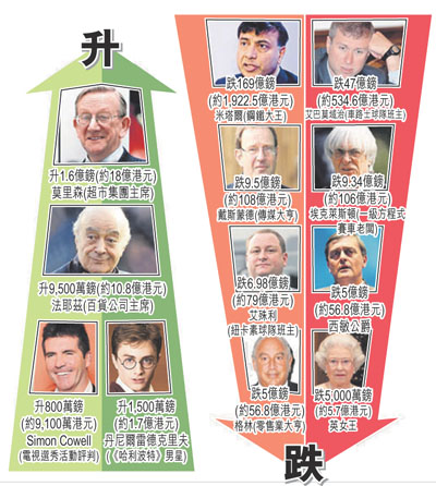 據(jù)香港文匯報(bào)報(bào)道,過去1年內(nèi),英國(guó)富豪1550億英鎊被蒸發(fā),是富豪榜出版21年以來最大的跌幅。富豪人數(shù)亦由75人減少至43人。