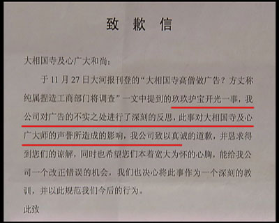就在記者對(duì)玖玖理療褲的虛假?gòu)V告進(jìn)行調(diào)查時(shí),河南開封大相國(guó)寺向記者出具了一份玖玖理療褲河南開封經(jīng)銷商,寫給大相國(guó)寺的一封致歉信,承認(rèn)自己假冒僧人的錯(cuò)誤行為,從此廣告中來(lái)自大相國(guó)寺的高僧空智,就如同人間蒸發(fā),再也沒(méi)有出現(xiàn)過(guò),取而代之的是佛教禪宗第36代傳人,但卻有著相同的名字和面孔——空智。