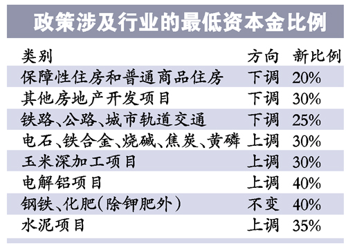 根據(jù)此次調(diào)整,大部分行業(yè)的最低資本金比例下調(diào)了5~10個(gè)百分點(diǎn),其中保障性住房和普通商品住房項(xiàng)目下調(diào)15個(gè)百分點(diǎn),大大超出此前的預(yù)期,而鐵路、公路等交通和大型基建項(xiàng)目也是此次資本金比例調(diào)整的主要受益對(duì)象。高污染、高能耗和產(chǎn)能過剩的項(xiàng)目則被上調(diào)最低資本金比例。