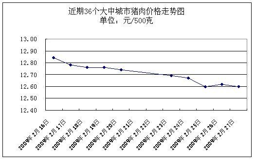 中新網(wǎng)3月2日電 據(jù)國家發(fā)展改革委價格監(jiān)測中心監(jiān)測,上周(2009.2.23-2009.2.27,下同)全國36個大中城市集市、超市豬肉(精瘦肉)平均零售價格每500克為12.64元,與前一周(2009.2.16-2009.2.20,下同)相比下降1.10%。