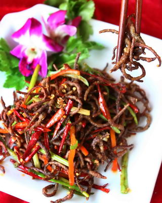 說起蚯蚓這種扭曲的小蟲,你的第一反應(yīng)也許是肥美的魚餌。不過,金堂趙鎮(zhèn)的一家農(nóng)家樂,卻把蚯蚓擺上餐桌,經(jīng)過油炸、爆炒,成為其招牌菜——“干煸地龍”,售價98元一份。這道有些古怪的菜品,吸引了不少獵奇的食客。昨日,記者走進(jìn)這家農(nóng)家樂的廚房,一探究竟。