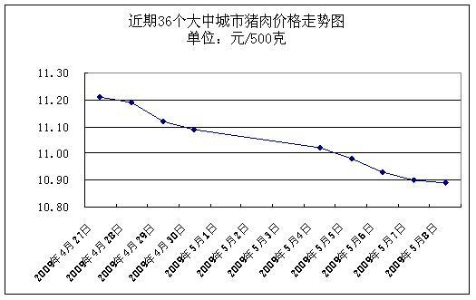 中新網(wǎng)5月11日電 據(jù)國家發(fā)展改革委價(jià)格監(jiān)測中心監(jiān)測,上周(2009.5.4-2009.5.8,下同)36個(gè)大中城市集市、超市豬肉(精瘦肉)平均零售價(jià)格每500克為10.94元,與前一周(2009.4.27-2009.4.30,下同)相比下降1.88%。