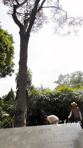 這株名木被稱為“廣州市區(qū)內(nèi)年齡最大的馬尾松 ”,已有106歲。主干胸徑已長到200厘米,需要兩個(gè)人才能環(huán)抱住。有人會(huì)覺得奇怪,手植松距今才98年,怎么會(huì)多了8年?公園管理人員解釋,1912 年,孫中山先生親臨黃花崗植樹時(shí),樹苗已8歲。當(dāng)年,孫中山先生一共種了四棵馬尾松樹,目前僅這一棵幸存。“簡(jiǎn)直就是‘大熊貓’,這棵馬尾松有特殊的紀(jì)念意義”。